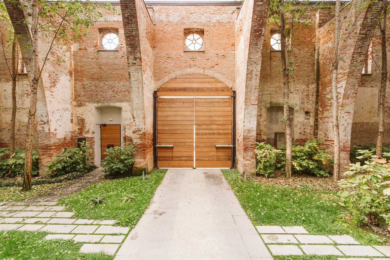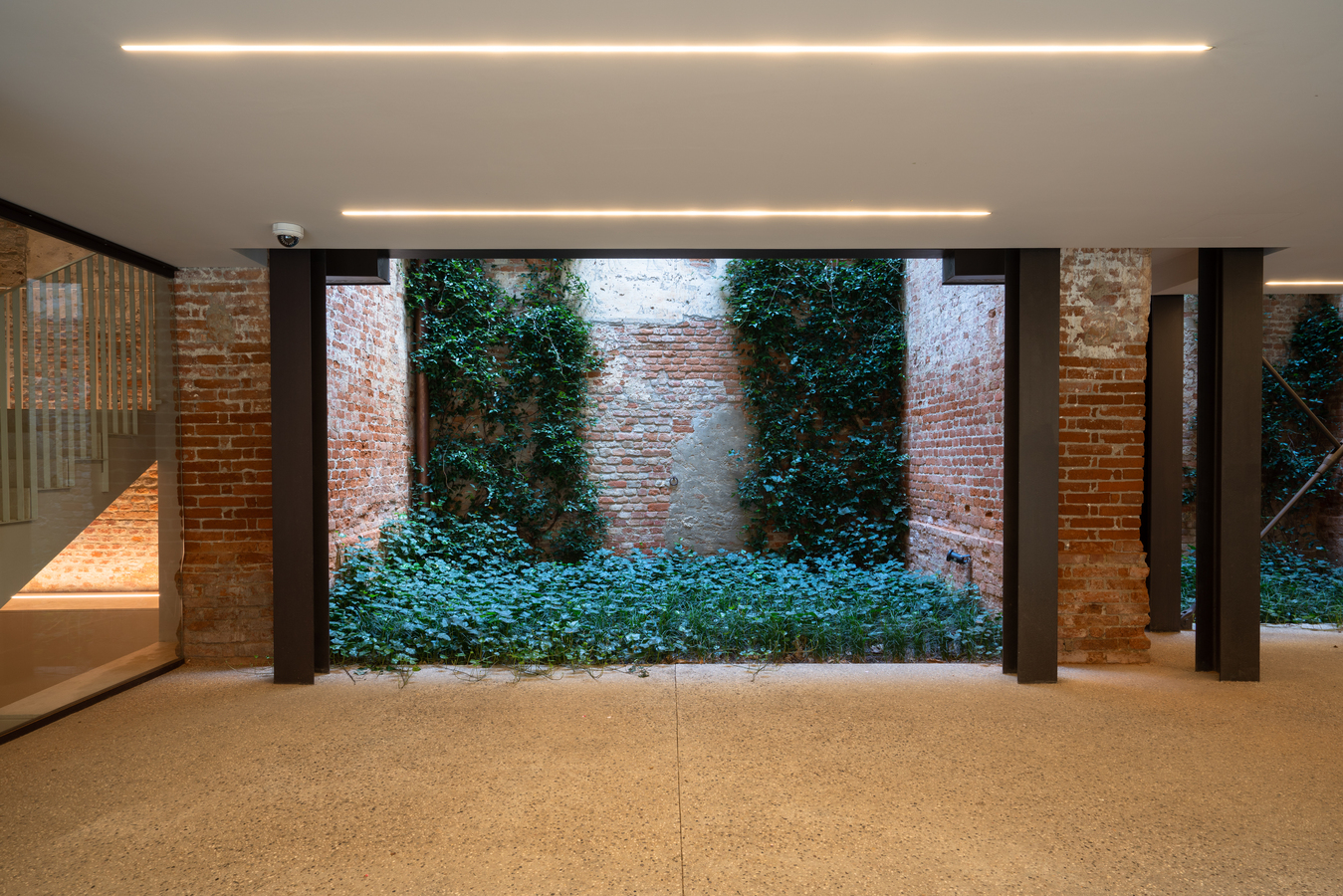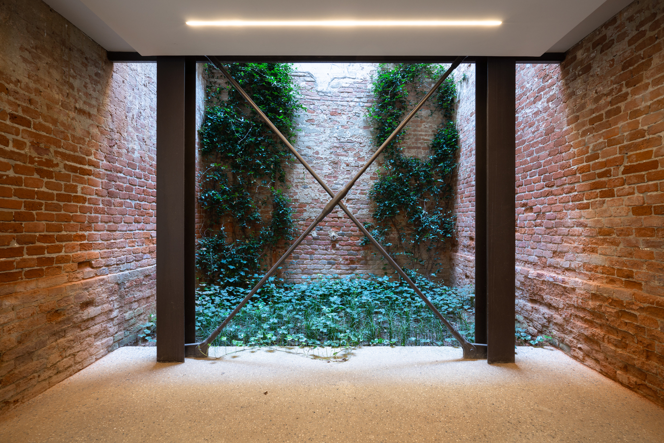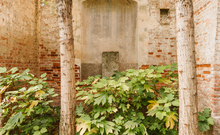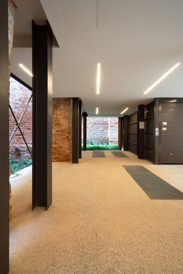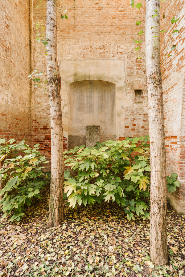 The existing brick structure has undergone careful restoration, as a lack of maintenance had led to its gradual deterioration. Following the collapse of the roof, which occurred in the 1970s, dense vegetation consisting of shrubs and tall trees grew inside, transforming what was once an enclosed, covered space into a sort of enchanted garden.
