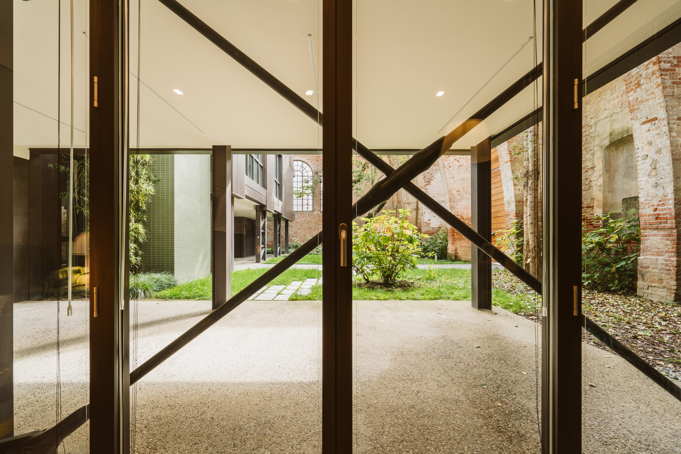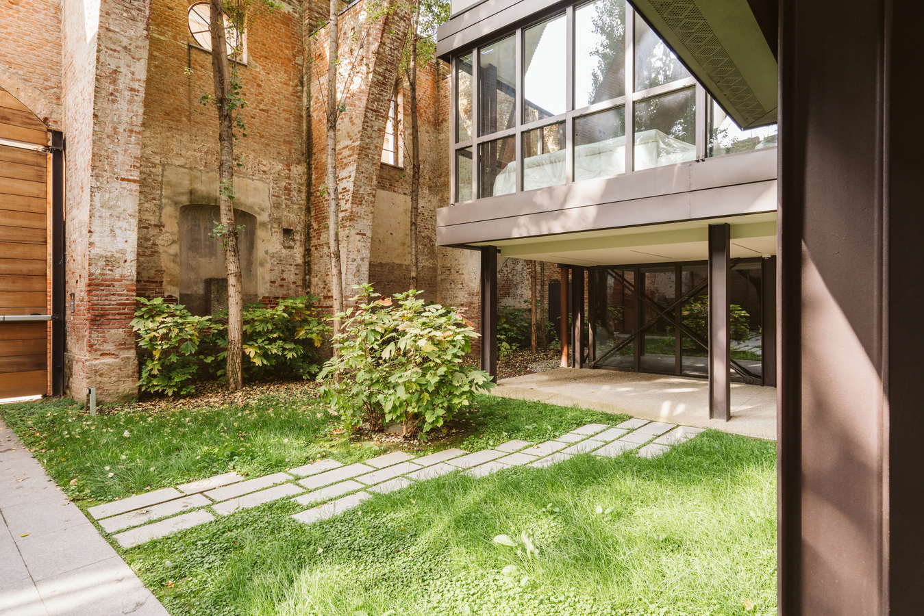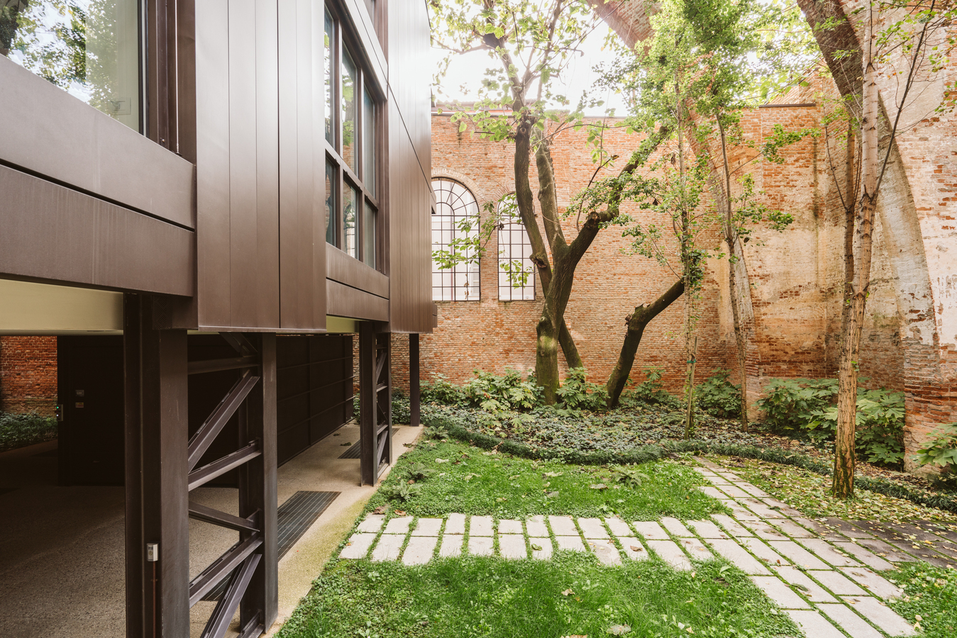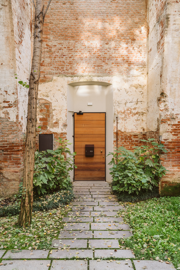 The existing brick structure has undergone careful restoration, as a lack of maintenance had led to its gradual deterioration. Following the collapse of the roof, which occurred in the 1970s, dense vegetation consisting of shrubs and tall trees grew inside, transforming what was once an enclosed, covered space into a sort of enchanted garden.