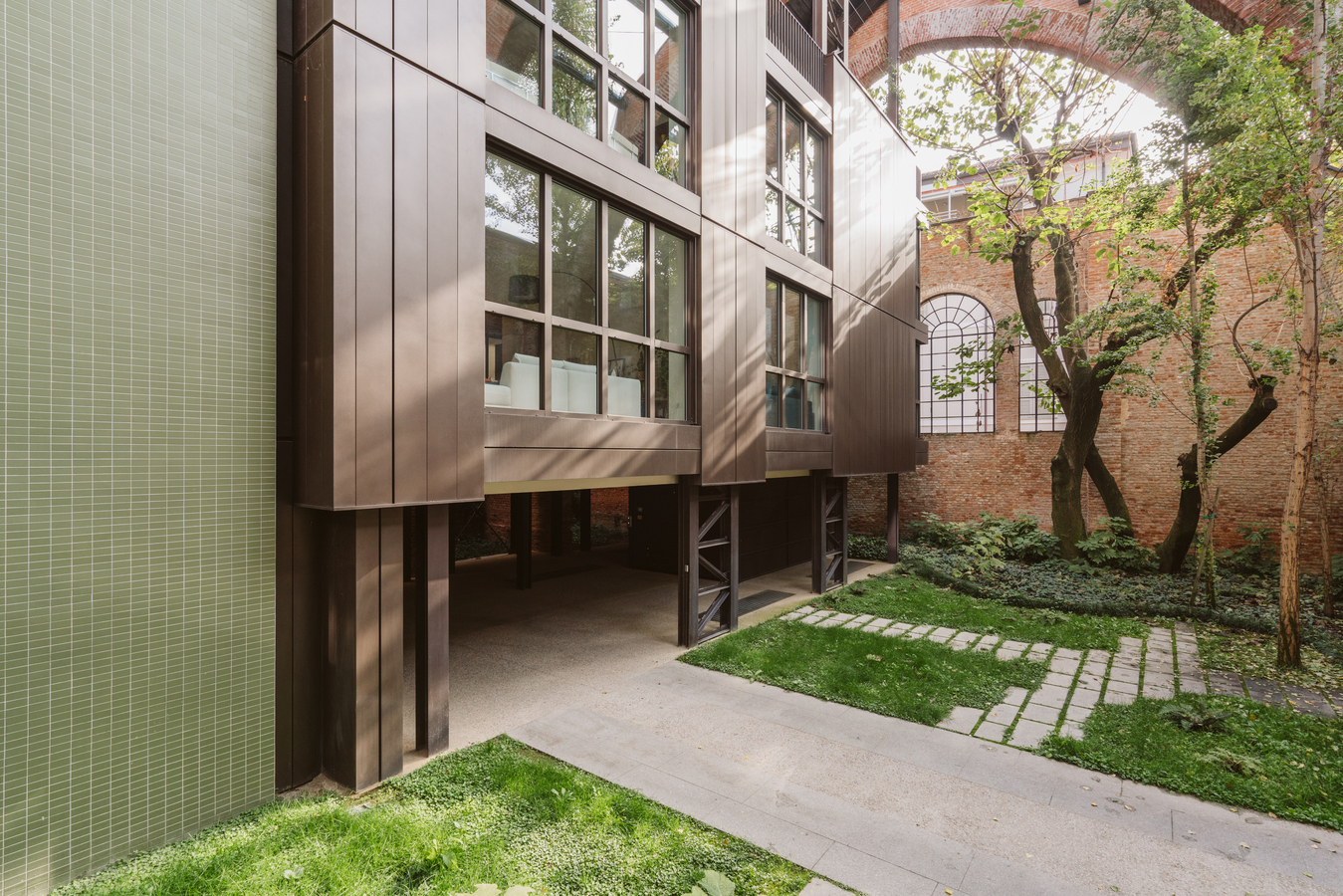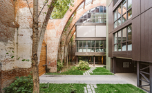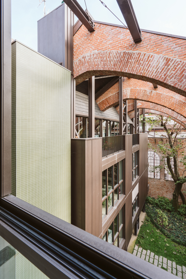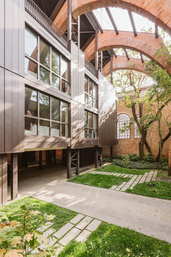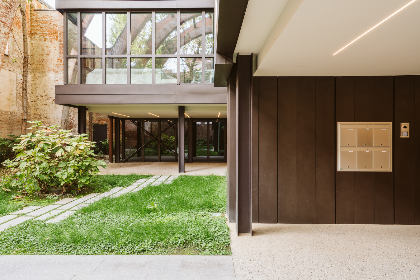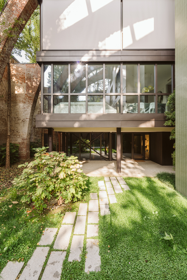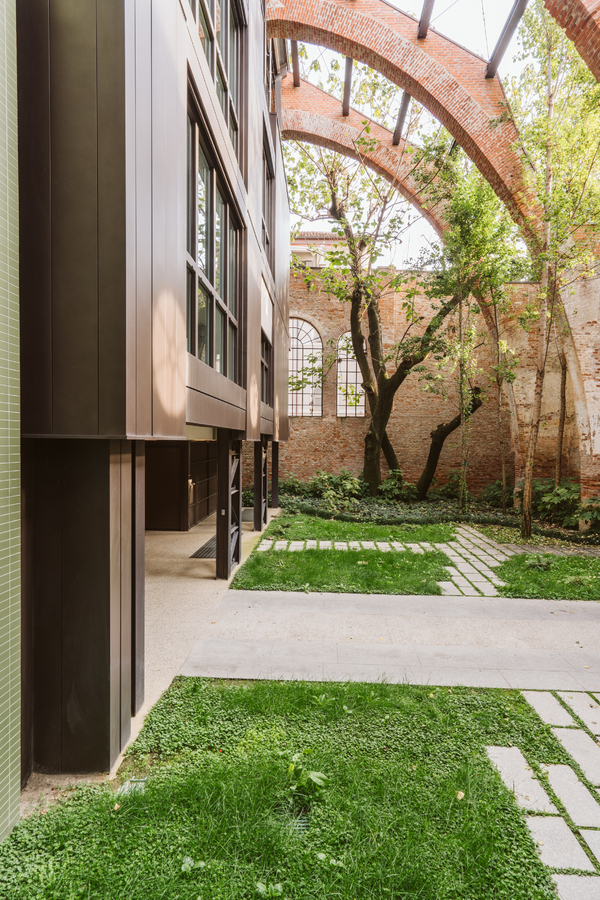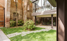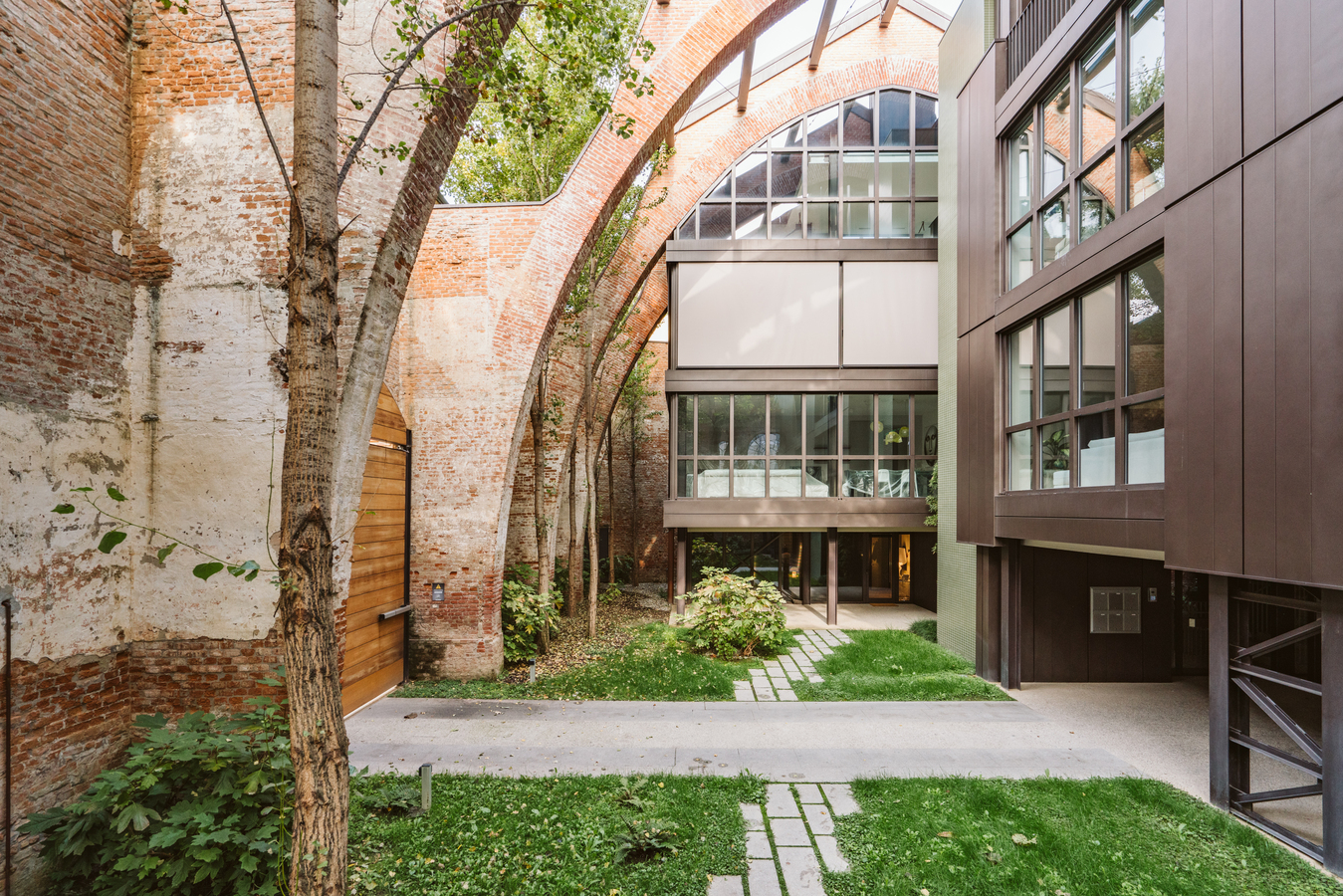 The new steel and glass structure is closely integrated with the existing building: the large glazed surfaces of the dwellings overlook the garden, against the backdrop of the historic building's brick walls.