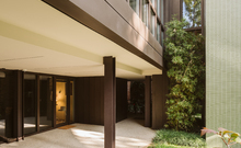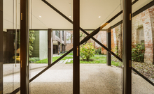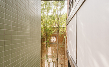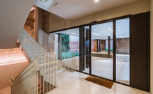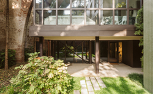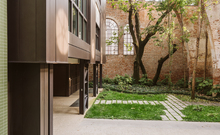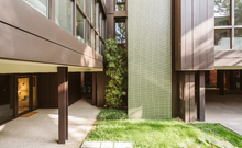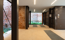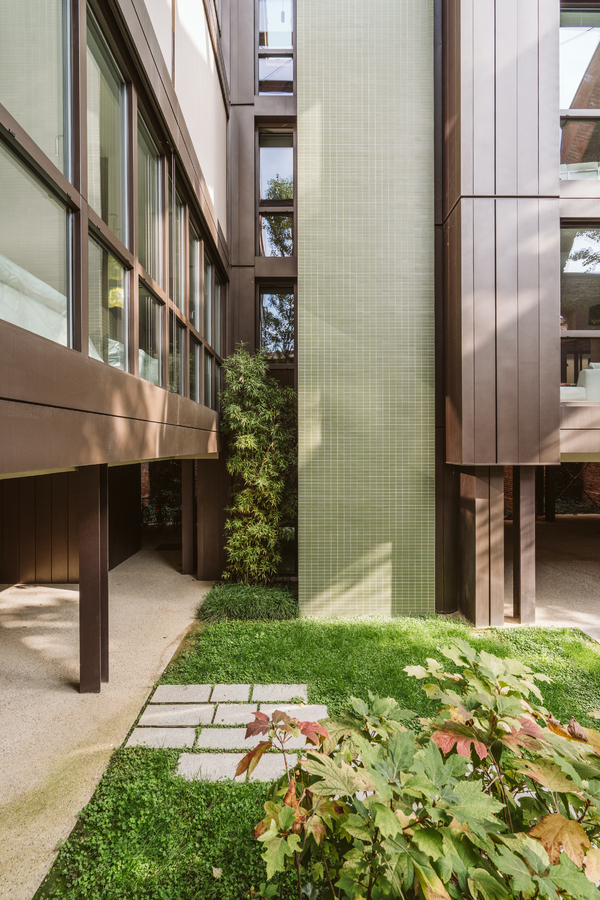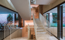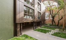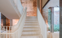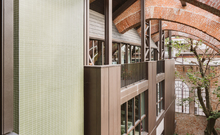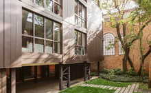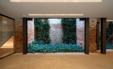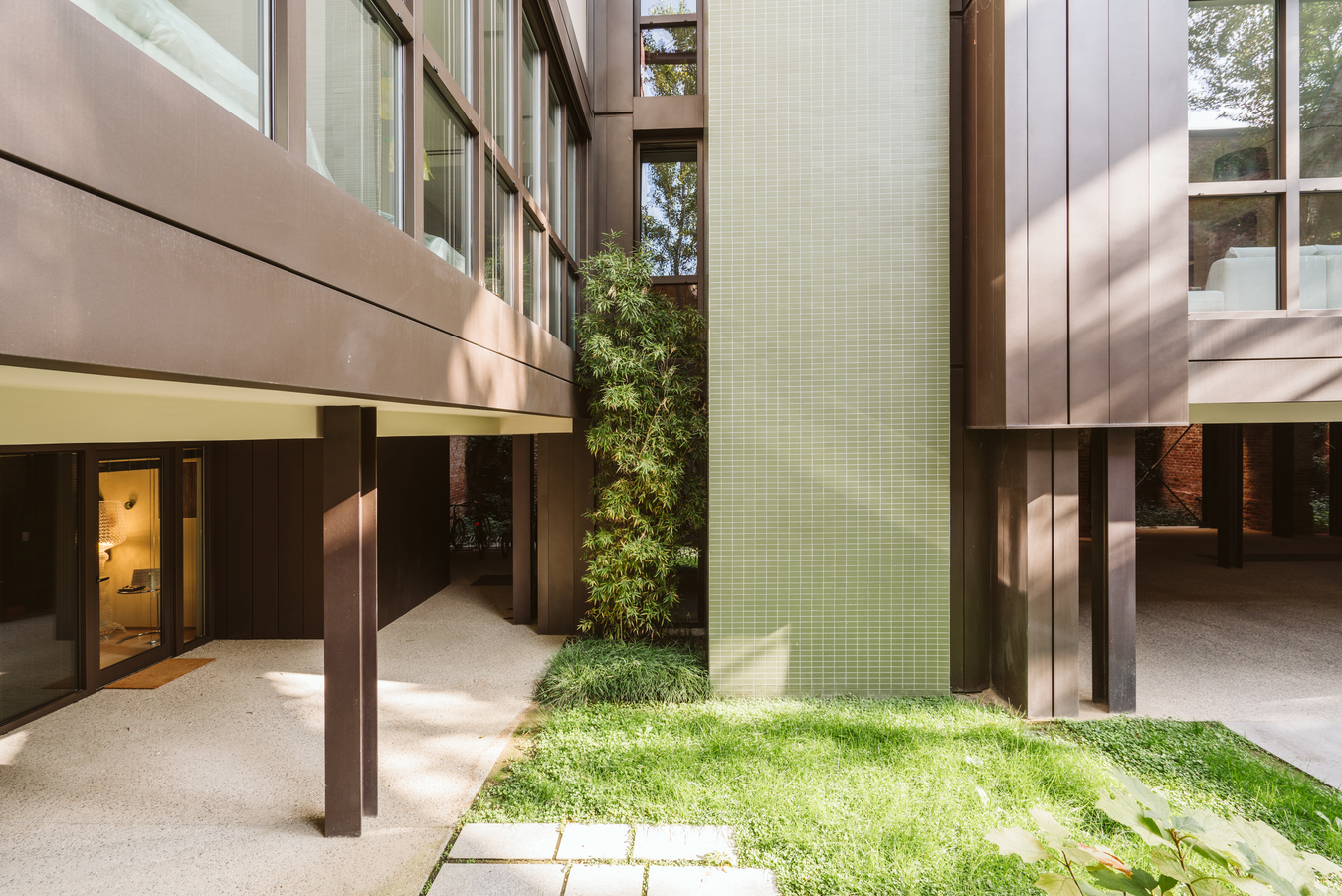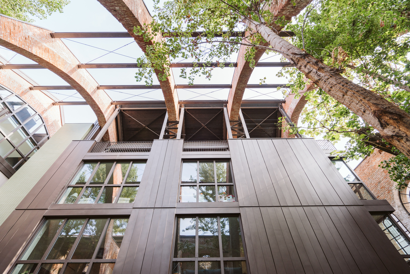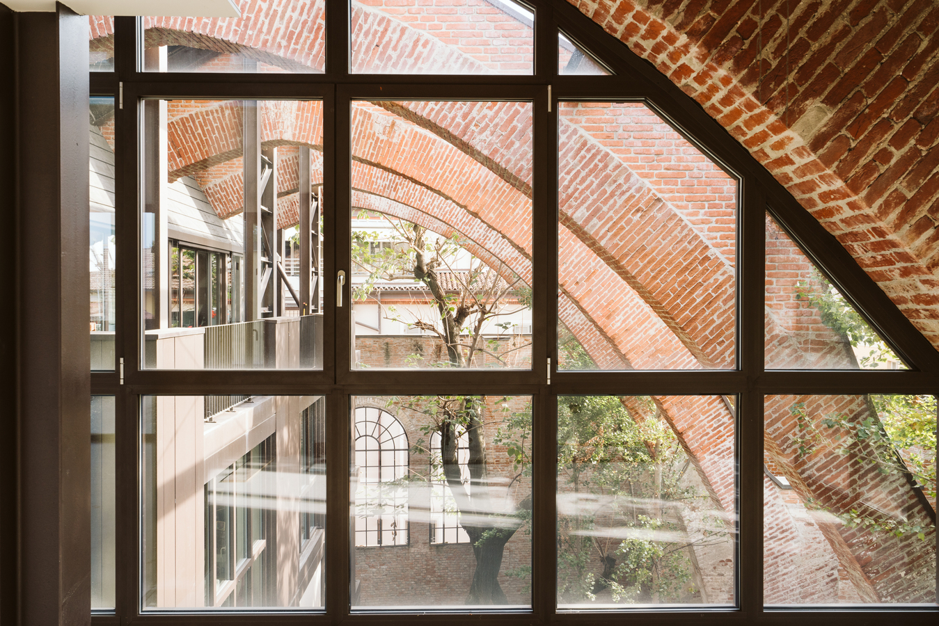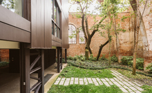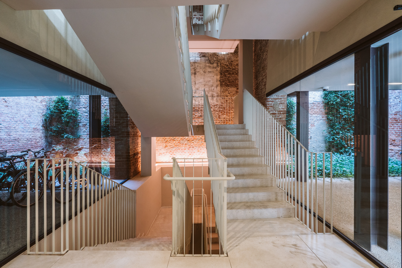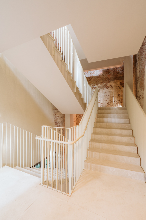 The new steel and glass structure is closely integrated with the existing building: the large glazed surfaces of the dwellings overlook the garden, against the backdrop of the historic building's brick walls.