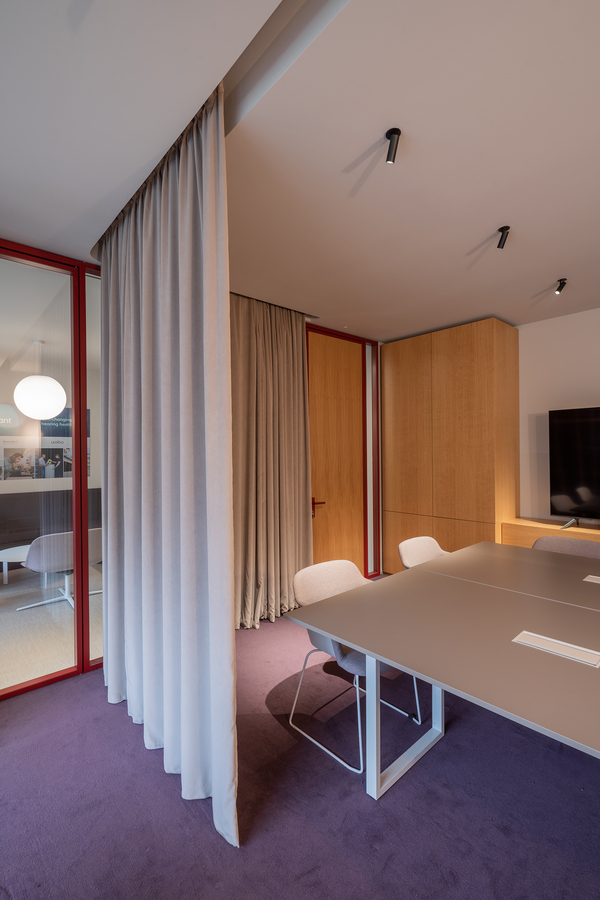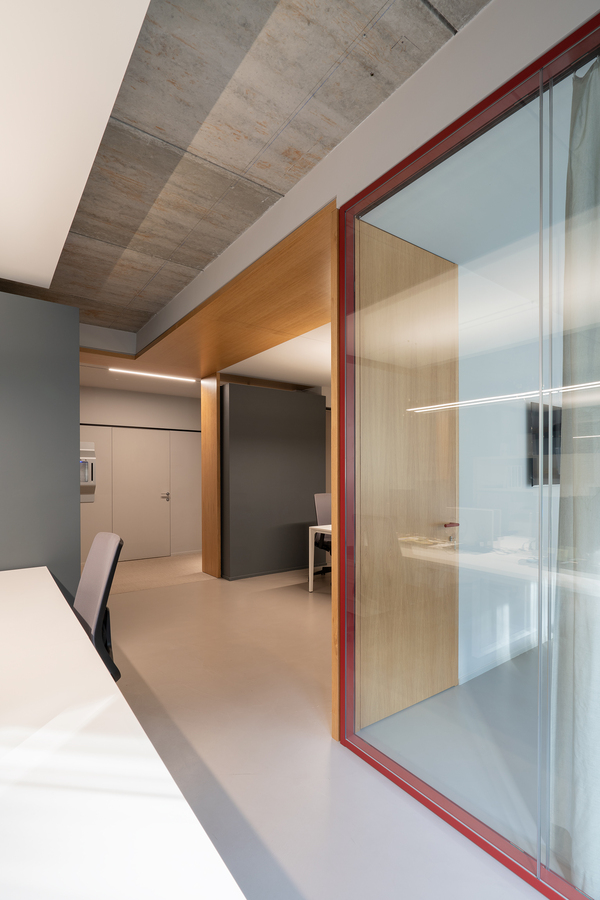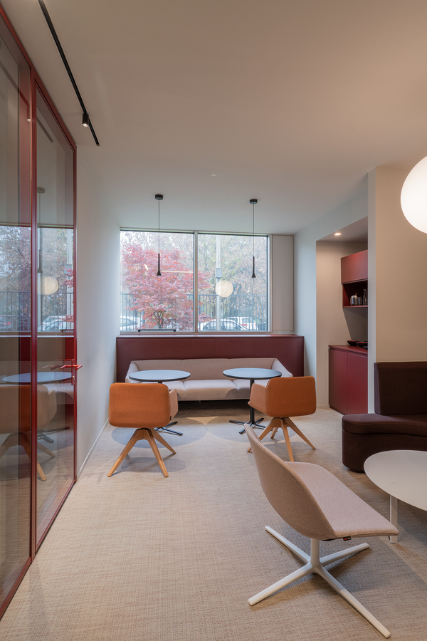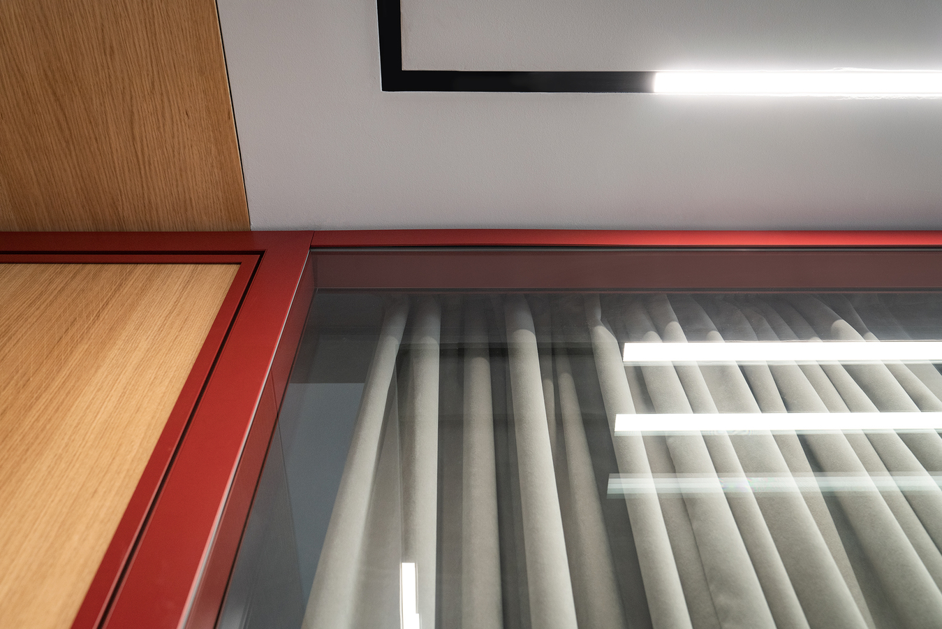 Burgundy lacquer finishes and red-painted steel profiles, combined with textile coverings ranging from wine red to powder pink and terracotta, contribute to a chromatic eclecticism that deliberately contrasts with the lighting and the exposed concrete ceilings of the open-plan space, which possess a strong technological and structural aesthetic.