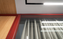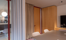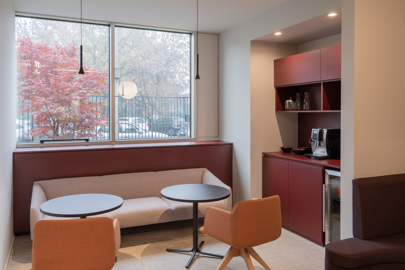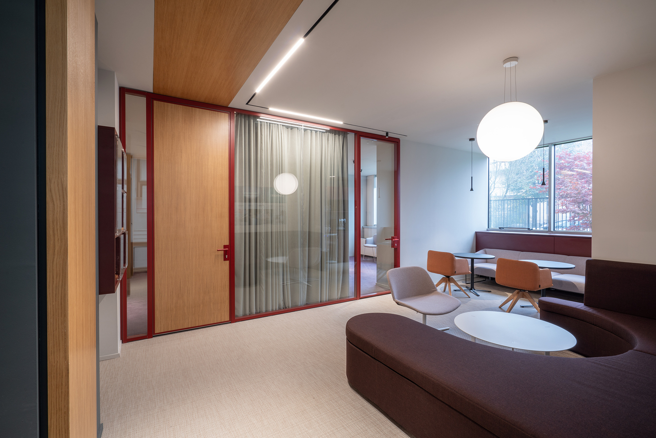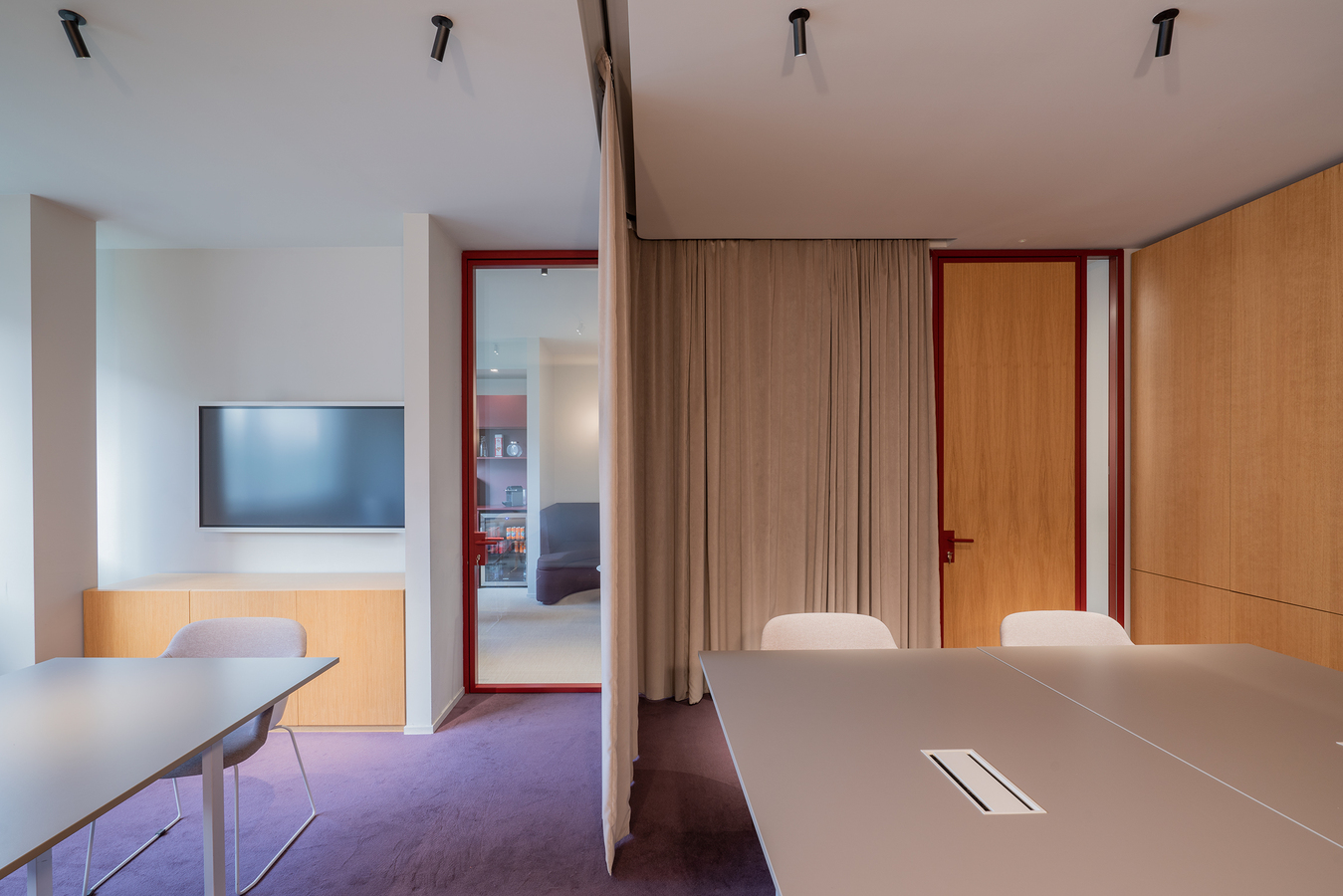 Burgundy lacquer finishes and red-painted steel profiles, combined with textile coverings ranging from wine red to powder pink and terracotta, contribute to a chromatic eclecticism that deliberately contrasts with the lighting and the exposed concrete ceilings of the open-plan space, which possess a strong technological and structural aesthetic.
