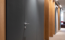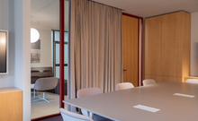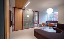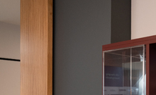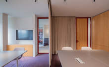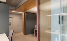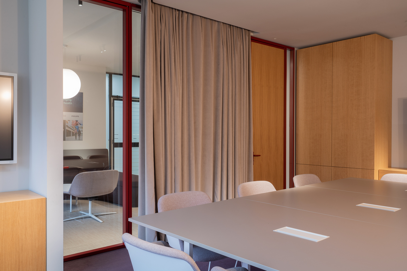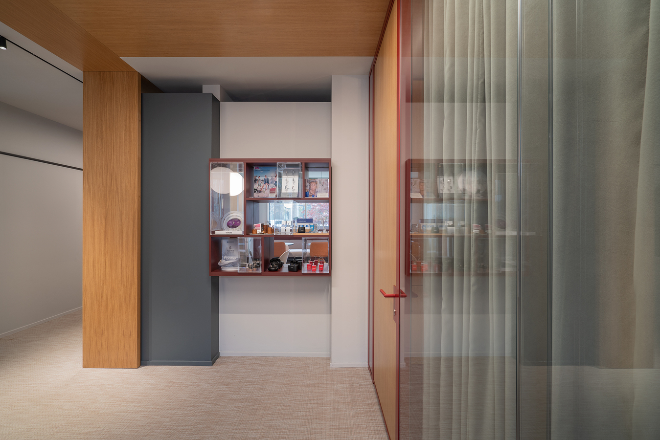 The choice of materials stems from an analysis of the company’s corporate identity, employing a desaturated shade of blue, enlivened by a series of more or less vibrant hues that adorn the fabrics and define the contours of the movable glass walls, alongside the use of oak in the reception area, serving as a key element—not only architecturally but also in terms of materiality—of the entire project. The woven vinyl fabric flooring, which covers the reception area and circulation space, becomes a fundamental unifying element that harmonises tone-on-tone with the monochromatic resin of the open-plan area and the mauve velvet carpet in the meeting room.