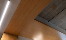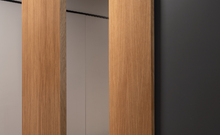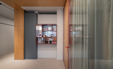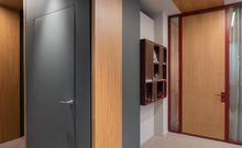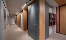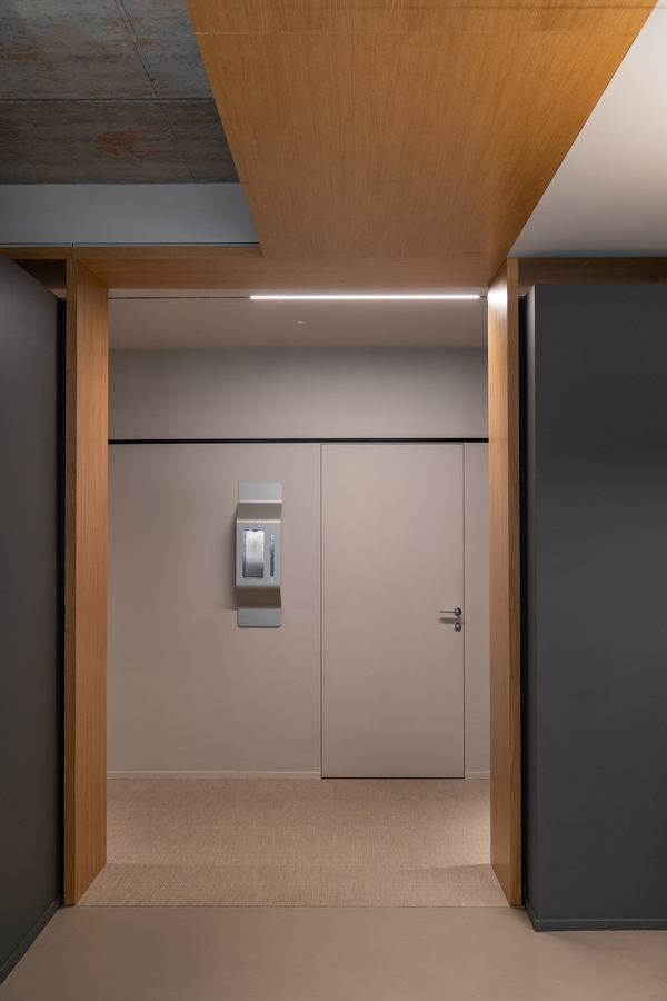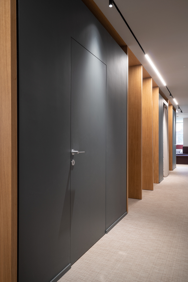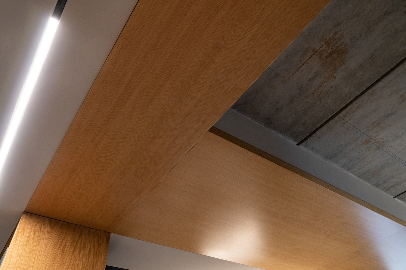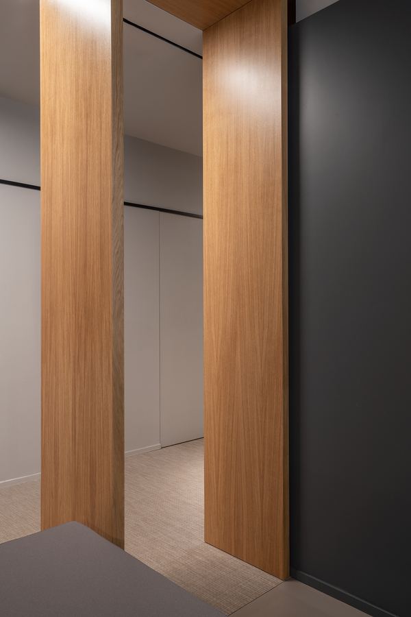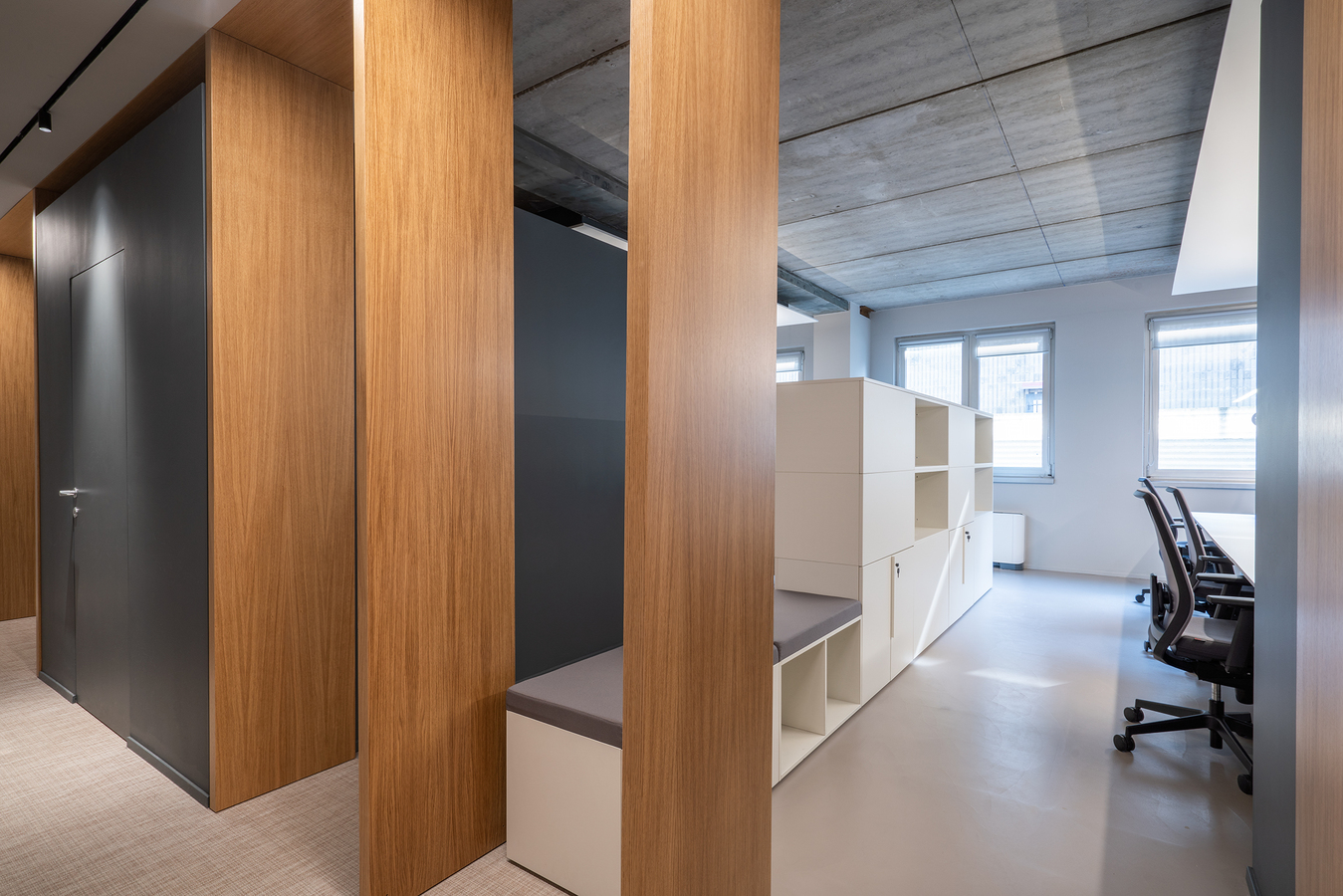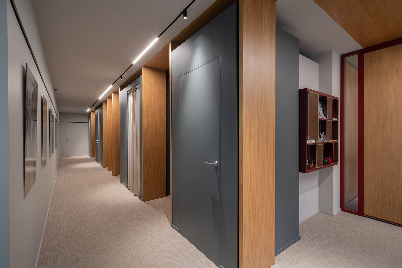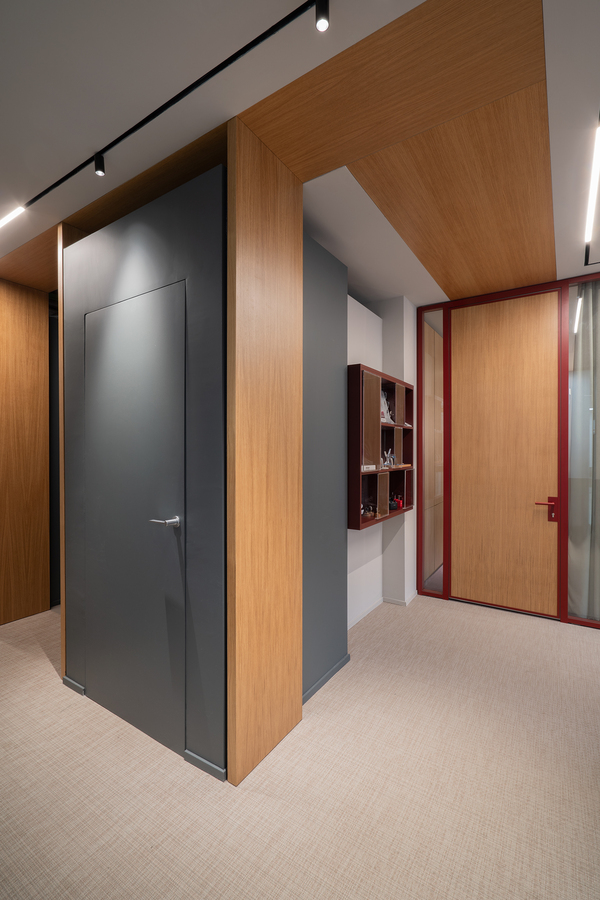 A wooden element, configured as a sort of full-height architectural brise-soleil, acts as a filter around which the entire design project revolves, separating—albeit not sharply—the circulation corridor from the open-plan space, and unfolding through vertical elements and ceiling inserts to reach the main meeting room, which is already visible upon entering the spaces. Within the wooden filter, blue-grey volumes are integrated, with direct access from the circulation area, serving as support spaces for the open-plan workspace.